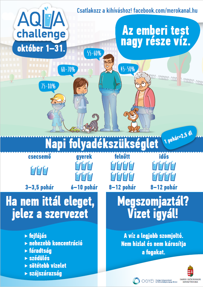 A megfelel minsg s mennyisg folyadkfogyaszts fontossgra szeretn felhvni a figyelmet oktberi kzssgi mdia kampnyval az OGYI (Orszgos Gygyszerszeti s lelmezs-egszsggyi Intzet) az EMMI Egszsggyrt Felels llamtitkrsga tmogatsval.